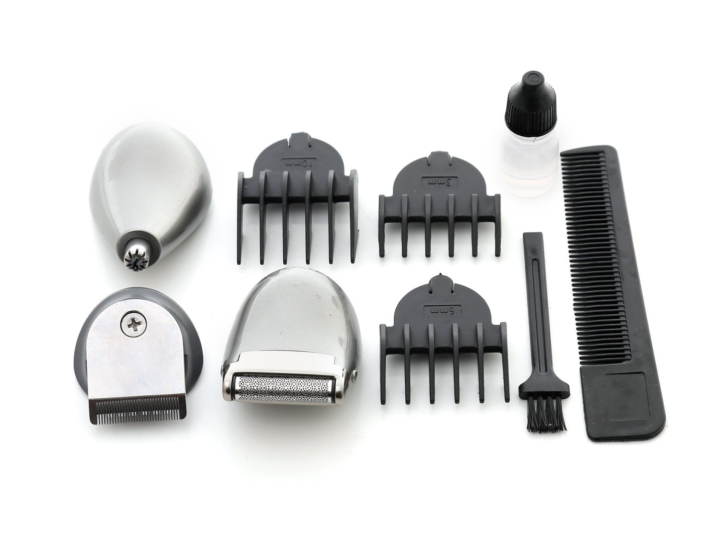 Aparat KlaussTech cu capete detasabile, marimi de tuns, adaptor nas si urechi, masina barbierit, trimmer de barba si mustati.