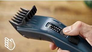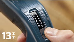 Pur si simplu selecteaza si blocheaza lungimea pe care o doresti. Pieptenele reglabil dispune de 12 setari de lungime blocabile, de la 1 la 23 mm, cu fix 2 mm intre fiecare lungime. Poti si sa scoti pieptenele pentru un tuns scurt de 0,5 mm.