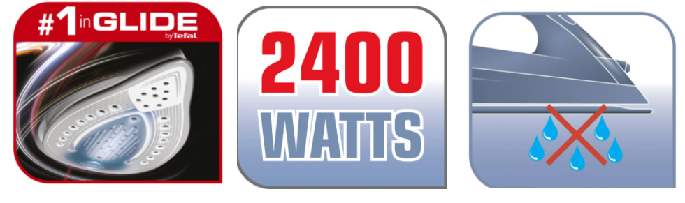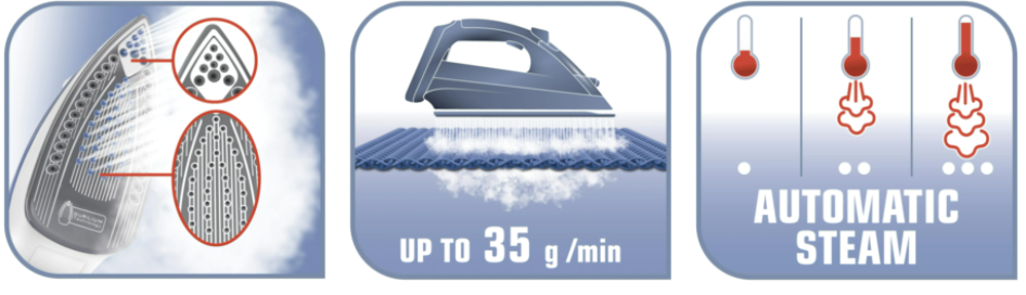 - Sesiuni de calcat rapide datorita talpii cu tehnologia TEFAL Durilium Airglide;