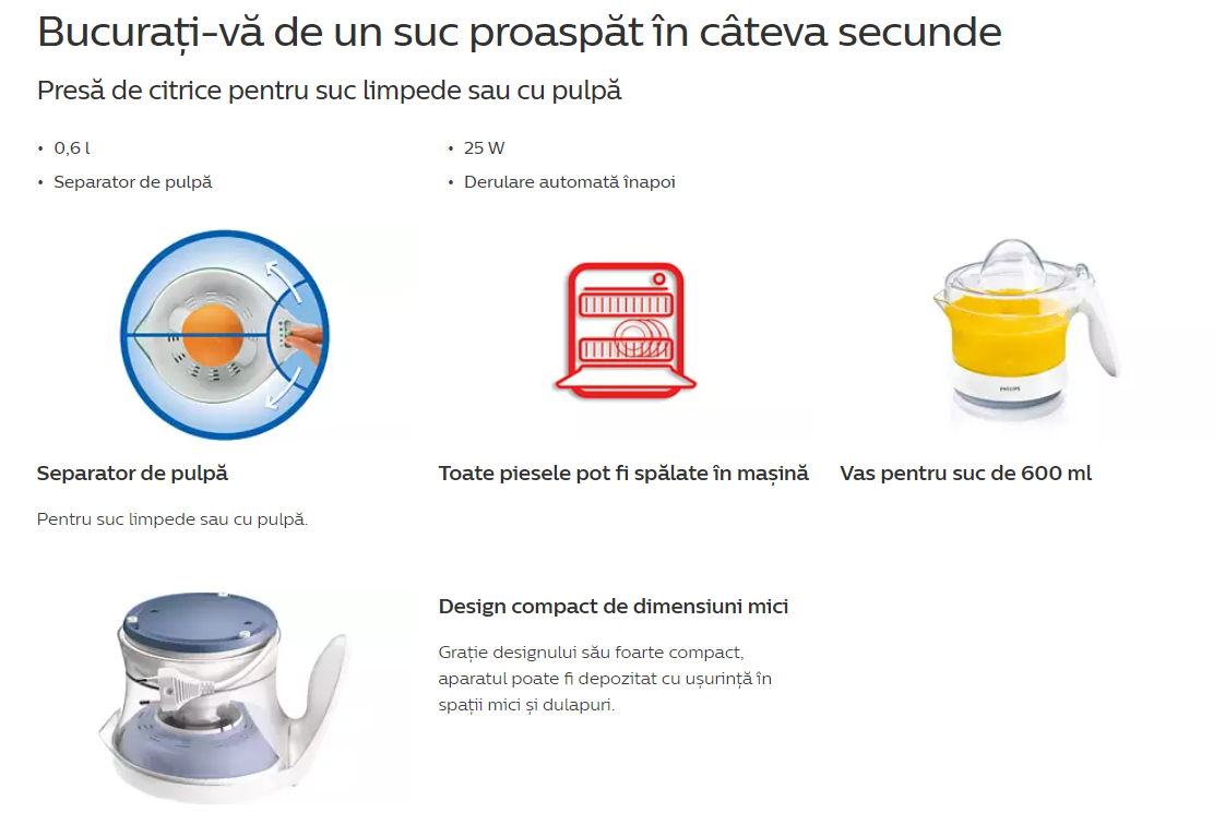 Presa Philips Citrice Collection, Material Vas San, 0.6 L, Putere 25 W, Anti-alunecare, Separator De Pulpa, Compartiment Pentru Cablu Integrat, Culoare Alb