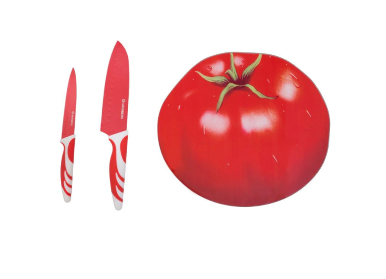 Set cutite inox cu tocator Klausstech in forma de rosie, 3 piese cu lama inox anti-bacterian, non-toxic, nu schimba gustul alimentelor feliate.