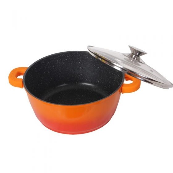 Cratita Cu Capac Din Sticla Termorezistenta, Capacitate 2.2 L, Dimensiuni 20x9.0 Cm, Material Exterior Aluminiu, Interior Marmura, Portocaliu