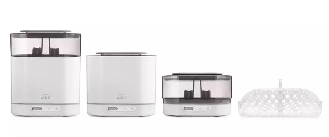 Cu un design unic si modular, sterilizatorul iti permite sa cureti biberoanele si accesoriile intr-un mod flexibil si sa le organizezi usor. Astfel, incarcarea si descarcarea sunt foarte comode. De asemenea, ai nevoie de un spatiu minim in bucatarie. Cosul pentru masina de spalat inclus mentine articolele mici impreuna in masina de spalat vase si iti permite sa le transferi pe toate deodata in sterilizator.